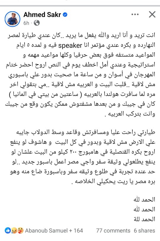 وكتب أحمد صقر، مصري مقيم بألمانيا، عبر حسابه على فيس بوك: أنت تريد وأنا أريد والله يفعل ما يريد.. كان عندي طيارة لمصر النهاردة، وبكرة عندي مؤتمر أنا speaker فيه ولمدة 5 أيام، والمواعيد متستفة فوق بعض حرفيًا، وكلها مواعيد مهمة واستراتيجية، وعندي أمل أخطف يوم في النص أروح أحضر ختام المهرجان في أسوان، ومن ساعة ما صحيت بدور على باسبورى مش لاقيه.