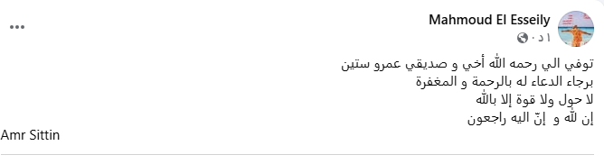 وكتب العسيلي منشورا، عبر حسابه الشخصي بموقع التواصل الاجتماعي فيس بوك، قال فيه: توفي إلى رحمه الله أخي وصديقي عمرو ستين، برجاء الدعاء له بالرحمة والمغفرة، لا حول ولا قوة إلا بالله إنَّا لله و إنّا إليه راجعون.