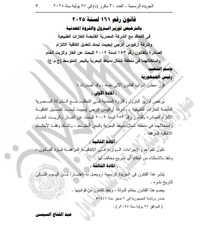 نشرت الجريدة الرسمية بعددها الصادر في 27 يوليو 2025 قانونًا جديدًا يحمل رقم 161 لسنة 2025، يقضي بالترخيص لوزير البترول والثروة المعدنية في التعاقد مع الشركة المصرية القابضة للغازات الطبيعية وشركة "آركيوس إنرجي إيجيبت"، بهدف تمديد اتفاقية الالتزام الصادرة بالقانون رقم 153 لسنة 2009.