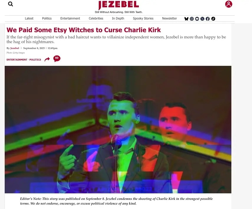 أثار تقرير نشره موقع Jezebel الأمريكي جدلًا واسعًا منذ 3 أيام، بعد أن كشف أحد كتّابه عن دفع أموال لساحرات عبر منصة Etsy لإلقاء تعويذات ضد الناشط اليميني تشارلي كيرك، وذلك قبل يومين فقط من اغتياله في ولاية يوتا.