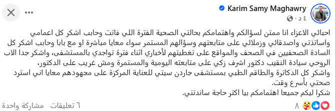 وقال كريم سامي مغاوري عبر منشور، على حسابه الشخصي بموقع التواصل الاجتماعي فيس بوك: أحبائي الأعزاء أنا ممتن لسؤالكم واهتمامكم بحالتي الصحية الفترة اللي فاتت، وحابب أشكر كل أعمامي وأساتذتي وأصدقائي وزملائي على متابعتهم وسؤالهم المستمر، سواء معايا مباشرة أو مع بابا وحابب أشكر كل السادة الصحفيين في الصحف والمواقع على تغطيتهم لأخباري خلال فترة تواجدي بالمستشفى.