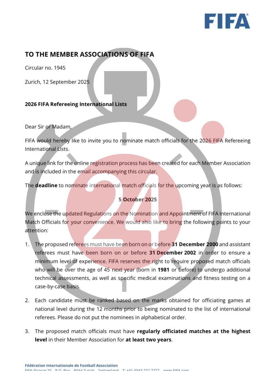 أصدر الاتحاد الدولي لكرة القدم التعميم رقم 1945 موجّهًا إلى جميع الاتحادات الأعضاء، بشأن ترشيح حكام المباريات لقوائم التحكيم الدولية لعام 2026، وذلك ضمن الإجراءات السنوية لتحديث قوائم الحكام الدوليين المعتمدين لدى الفيفا.