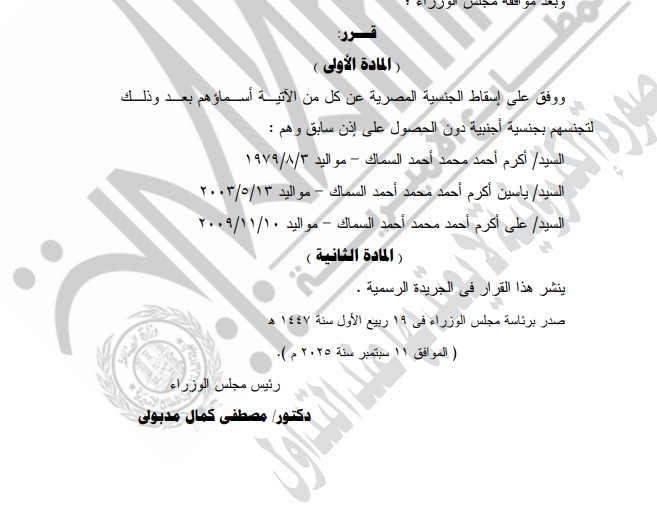 نشرت الجريدة الرسمية قرار الدكتور مصطفى مدبولي رئيس مجلس الوزراء بإسقاط الجنسية عن أكرم أحمد السماك ونجليه ياسين وعلي.