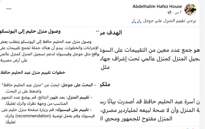وكتب الحساب الرسمي لـ أسرة عبد الحليم حافظ عبر فيس بوك، تفاصيل الأمر من خلال منشور، جاء فيه: وصول منزل عبد الحليم حافظ إلى اليونسكو يتطلب بعض الإجراءات والخطوات، وهناك حملة لجمع تقييمات على مواقع مثل جوجل وفيسبوك لدعم تسجيل المنزل كمنزل عالمي على أرض مصرية.