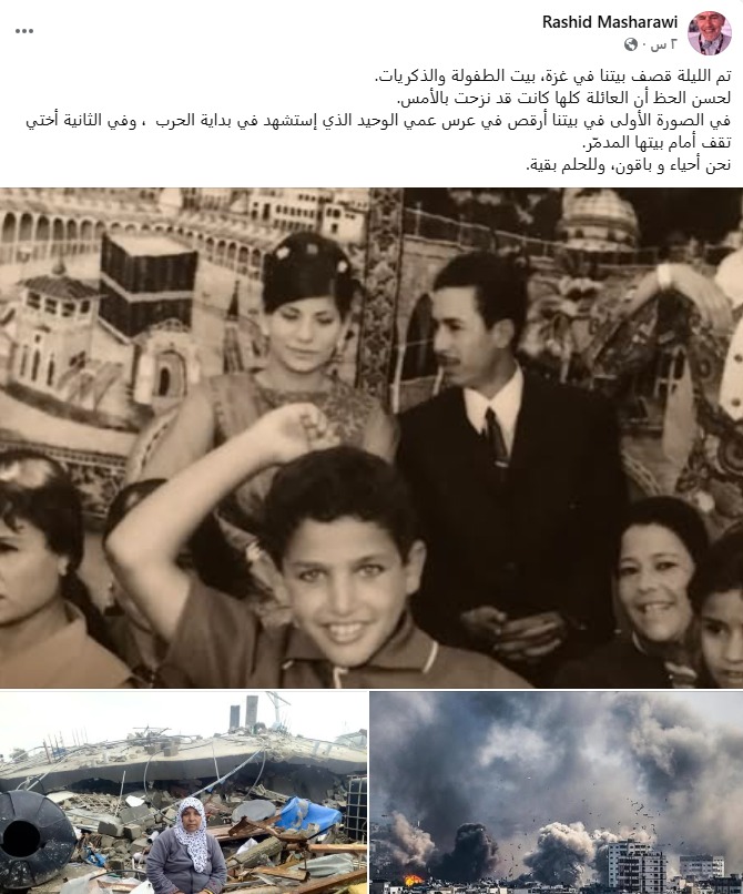 ونشر رشيد مشهراوي عدة صور من المنزل، بعد تعرُّضه للقصف على يد قوات الاحتلال الإسرائيلي، وعلق عليها عبر حسابه الشخصي بـ فيس بوك، قائلًا: تم الليلة قصف بيتنا في غزة، بيت الطفولة والذكريات، لحسن الحظ أن العائلة كلها كانت قد نزحت بالأمس، في الصورة الأولى في بيتنا أرقص في عرس عمي الوحيد الذي استشهد في بداية الحرب، وفي الثانية أختي تقف أمام بيتها المدمّر، نحن أحياء وباقون، وللحلم بقية.