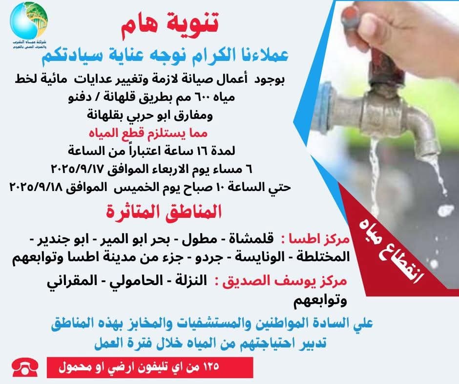 وطالبت الشركة المواطنين وأصحاب المخابز والمستشفيات تدبير احتياجاتهم من المياه خلال فترة الانقطاع كما توفر الشركة سيارات مياه صالحة للشرب بالمناطق المتأثرة.