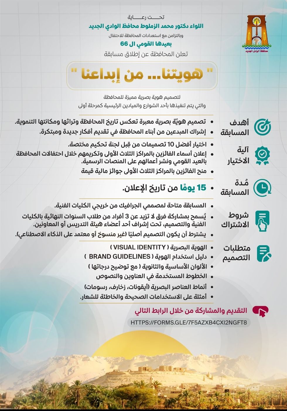 وقال المحافظ، إن إطلاق هذه المسابقة في إطار جهود الوادي الجديد للحفاظ على هويتها الثقافية وإبراز ملامحها التاريخية والتنموية، بما يعزز حضورها على الخريطة الوطنية ويمنح أبناءها فرصة المساهمة في رسم ملامحها البصرية المستقبلية.