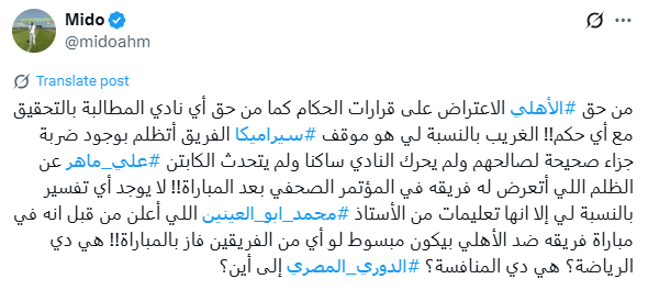 وكتب ميدو عبر حسابه على إكس: من حق الأهلي الاعتراض على قرارات الحكام، كما من حق أي نادي المطالبة بالتحقيق مع أي حكم.