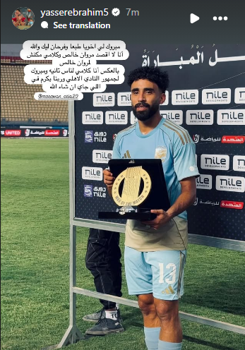 ونشر ياسر إبراهيم عبر حسابه الرسمي على إنستجرام رسالة قال فيها:"مبروك لأخويا طبعًا وفرحان ليك والله.. أنا لا أقصد مروان خالص، وكلامي مكنش ليه، بالعكس أنا كلامي لناس تانية.. ومبروك لجمهور النادي الأهلي، وربنا يكرم في اللي جاي إن شاء الله."