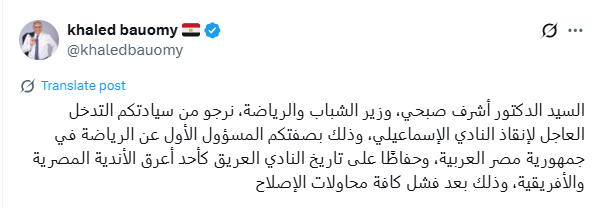 وكتب بيومي في منشور نشره عبر حسابه الرسمي على منصة X (تويتر سابقًا): الدكتور أشرف صبحي، وزير الشباب والرياضة، نرجو التدخل العاجل لإنقاذ النادي الإسماعيلي، وذلك بصفتكم المسؤول الأول عن الرياضة في جمهورية مصر العربية، وحفاظًا على تاريخ النادي العريق كأحد أعرق الأندية المصرية والإفريقية، وذلك بعد فشل كافة محاولات الإصلاح.