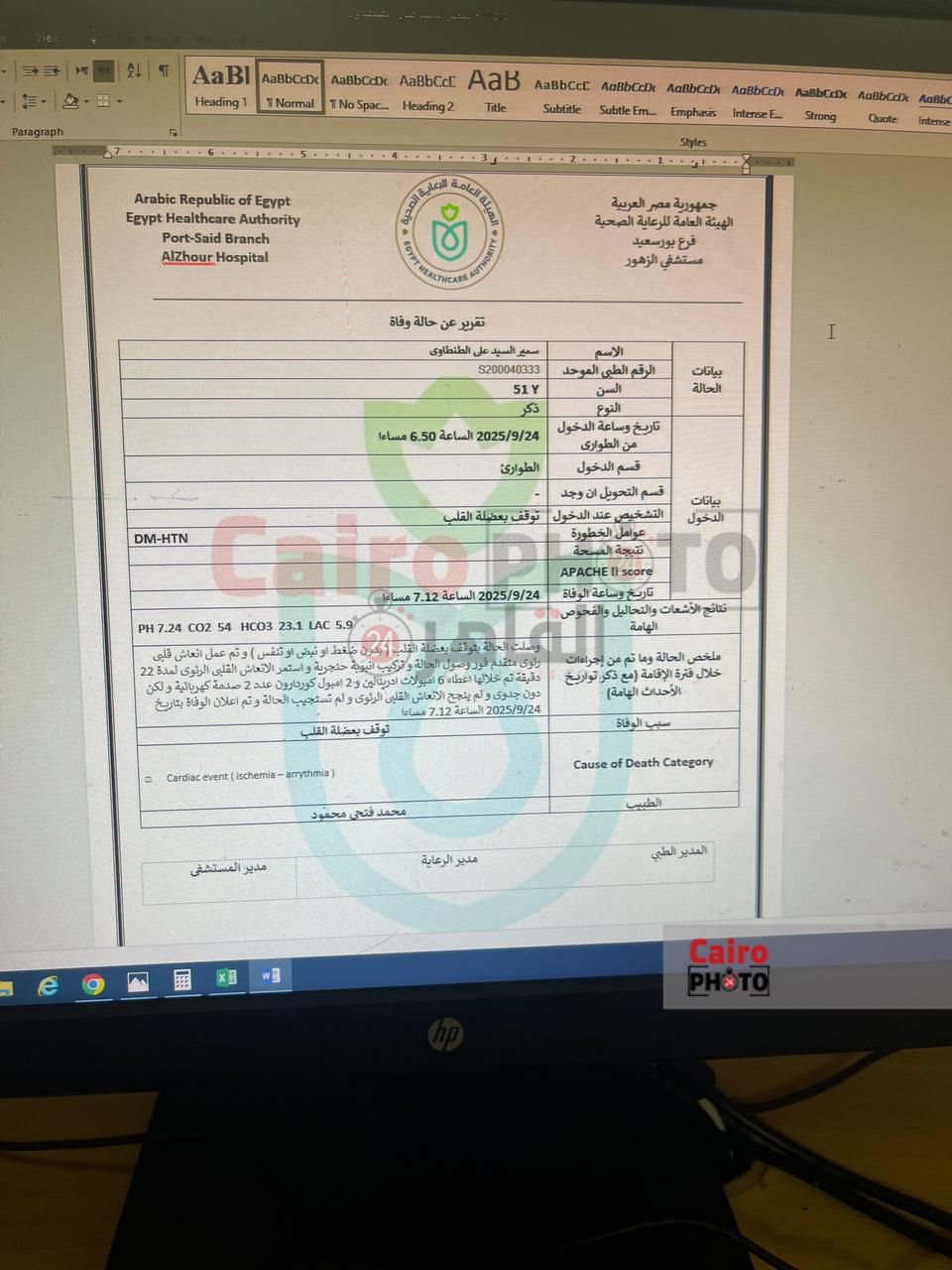 حصل القاهرة 24 على صورة من التقرير الطبي الصادر عن مستشفى الزهور التابع لهيئة الرعاية الصحية، بشأن وفاة اللاعب سمير السيد الطنطاوي (51 عامًا)، الذي توفي مساء الأربعاء 24 سبتمبر 2025، خلال مشاركته في بطولة الجمهورية لتنس الطاولة بالصالة المغطاة بالمدينة الرياضية في بورسعيد.