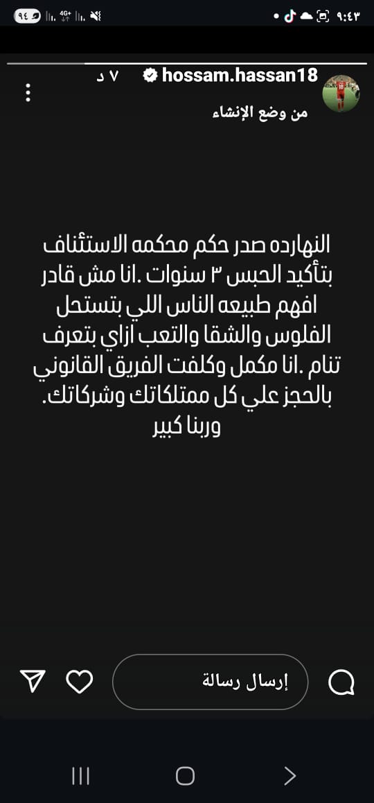 وقال اللاعب حسام حسن لاعب مودرن سبورت: النهاردة صدر حكم محكمة الاستئناف بتأكيد الحبس 3 سنوات، أنا مش قادر أفهم طبيعة الناس اللي بتستحل الفلوس والشقى والتعب إزاي بتعرف تنام، أنا مكمل وكلفت الفريق القانوني بالحجز على كل ممتلكاته وشركاته، وربنا كبير.