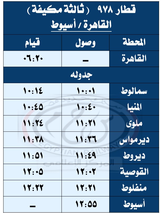 وشملت قائمة التعديلات الجديدة تشغيل قطار 930 (ثانية فاخرة) من القاهرة إلى أسيوط على أن تكون مواعيد تحركه طبقًا للجدول المرفق، على أن يعود بقطار 929 (ثانية فاخرة) وتكون مواعيد تحركه طبقًا للجدول المرفق أيضًا.