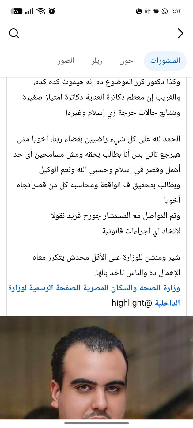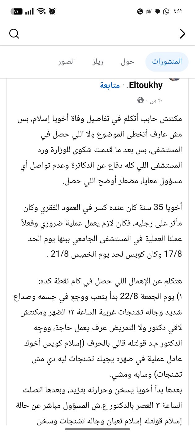 شهدت مواقع التواصل الاجتماعي حالة واسعة من التفاعل بعد تدوينة نشرها أحد المواطنين، كشف فيها تفاصيل ما وصفه بـ"إهمال طبي جسيم" تعرض له شقيقه الراحل إسلام (35 عامًا) داخل المستشفى الجامعي ببنها، ما أدى إلى وفاته عقب تدهور حالته الصحية.