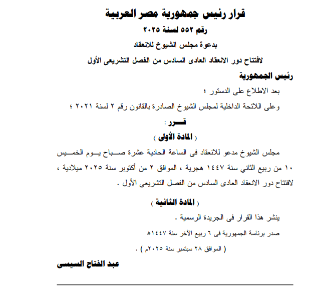 ونص القرار الجمهوري رقم 546 لسنة 2025 بدعوة مجلس النواب للانعقاد، وذلك في تمام الساعة العاشرة من صباح يوم الأربعاء الموافق 1 أكتوبر 2025، لافتتاح دور الانعقاد العادي السادس من الفصل التشريعي الثاني، وفقا لما نشرته الجريدة الرسمية.