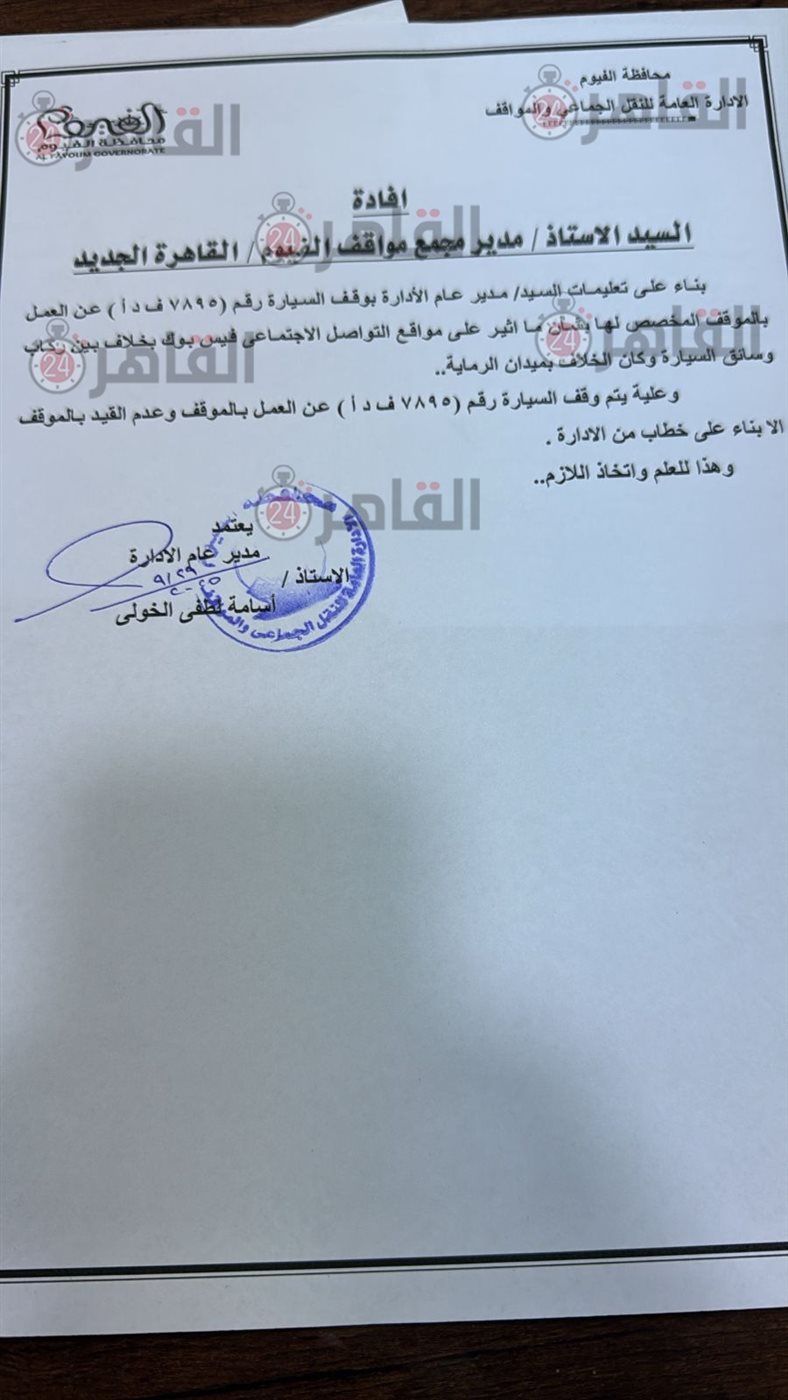 أصدر أسامة الخولي، مدير إدارة المواقف بمحافظة الفيوم، قرارًا بوقف السيارة رقم " 7895 ف د أ " عن العمل في موقف القاهرة/ الفيوم، وعدم القيد بالموقف إلا بعد صدور خطاب من الإدارة، وذلك بعد رصد تعدي سائق الميكروباص على راكب بسبب اعتراضه على دفع تعريفة ركوب مخالفة للمقررة من قبل المحافظة.