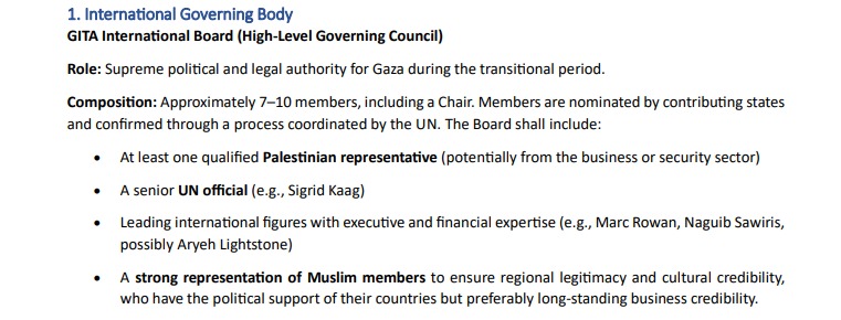وشددت الوثيقة على ضرورة أن يشمل المجلس ممثلًا فلسطينيًا مؤهلًا من قطاعي الأعمال أو الأمن، مسؤولًا رفيعًا في الأمم المتحدة، مثل سيجريد كاج، وشخصيات دولية بارزة ذات خبرة تنفيذية ومالية، ومن بينهم الملياردير المصري نجيب ساويرس، إلى جانب مارك روان وربما آرييه لايتستون، وتمثيلًا قويًا لأعضاء مسلمين، لضمان الشرعية الإقليمية والمصداقية الثقافية، على أن يكونوا مدعومين سياسيًا من دولهم، ويفضل أن يتمتعوا بخبرة طويلة في قطاع الأعمال.