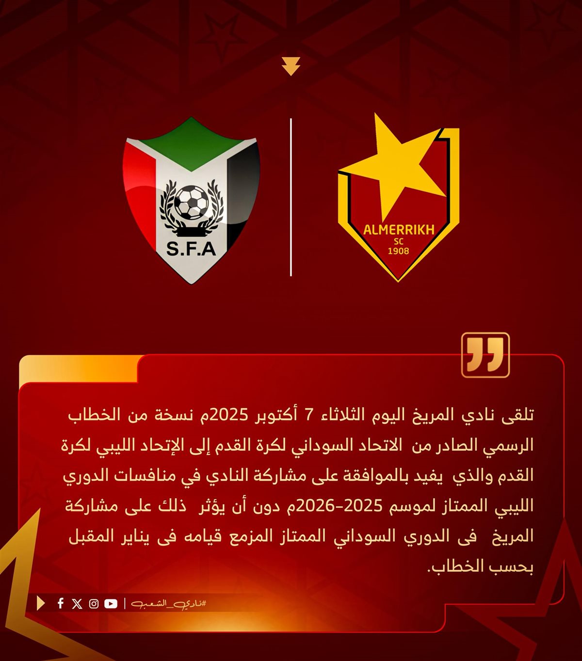 وقال المريخ السوداني في منشور له عبر حسابه على فيسبوك: تلقى نادي المريخ اليوم الثلاثاء 7 أكتوبر 2025م نسخة من الخطاب الرسمي الصادر من الاتحاد السوداني لكرة القدم إلى الاتحاد الليبي لكرة القدم والذي يفيد بالموافقة على مشاركة النادي في منافسات الدوري الليبي الممتاز الموسم 2025-2026م دون أن يؤثر ذلك على مشاركة المريخ في الدوري السوداني الممتاز المزمع قيامه في يناير المقبل بحسب الخطاب.