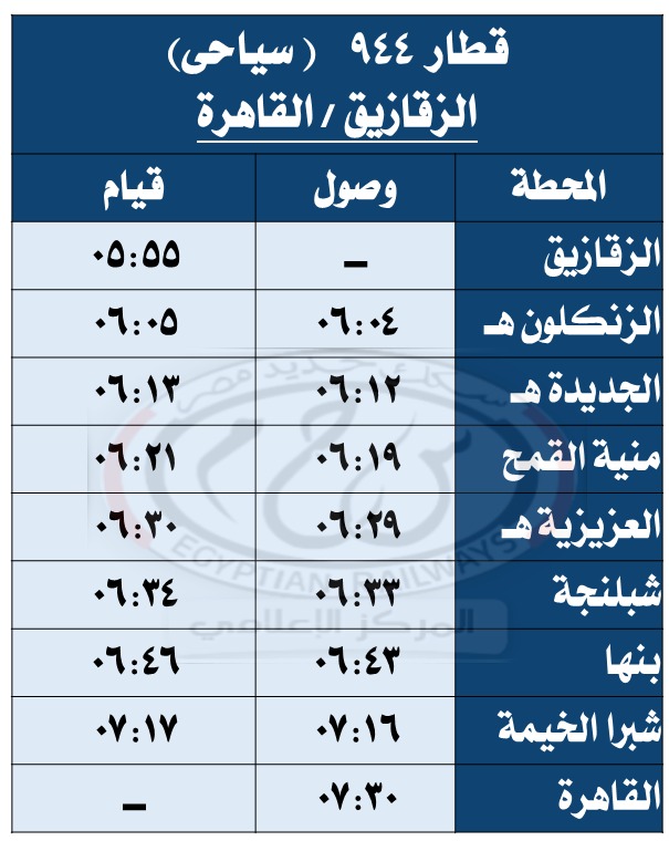 أعلنت الهيئة القومية لسكك حديد مصر، وقوف قطاري 957 – 944 القاهرة / الزقازيق سياحي والعكس، بمحطة الجديدة مركز منيا القمح بالشرقية، اعتبارا من السبت 11 أكتوبر 2025.