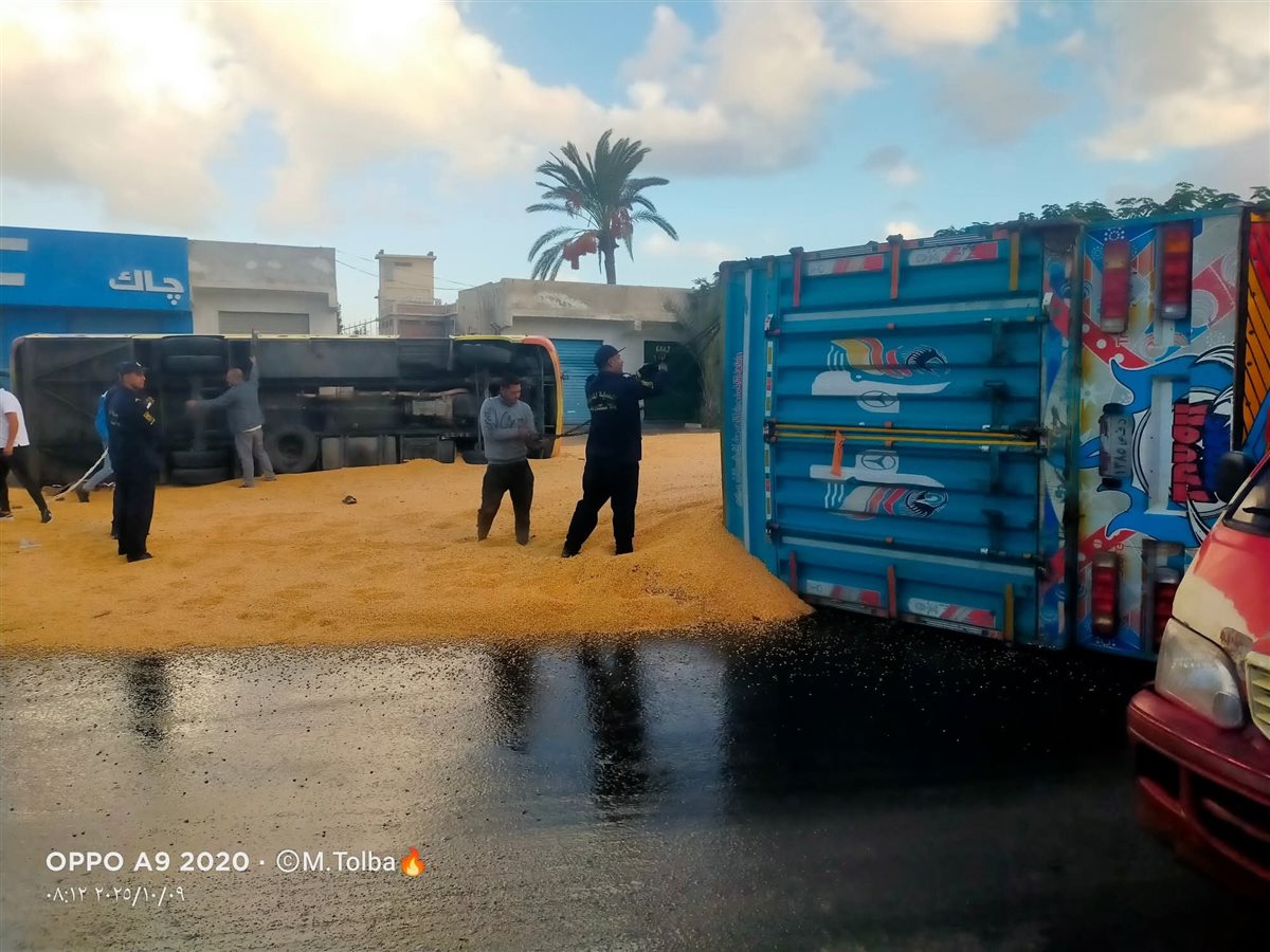 أصيب 5 أشخاص، في حادث تصادم سيارة نقل ثقيل مع أتوبيس بطريق الإسكندرية الصحراوي، حيث انقلبت السيارة بحمولتها من الغلة في وسط الطريق وأسفرت عن وقوع الحادث.