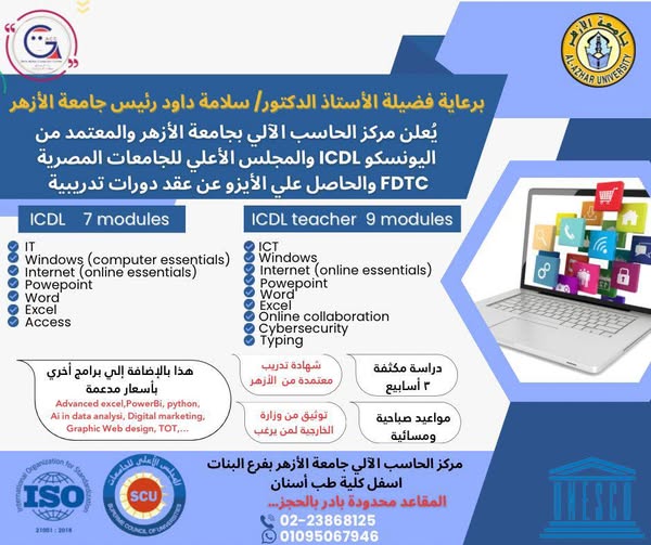 أعلنت الدكتورة عفاف أبو الفتوح صالح، مديرة مركز الحاسب الآلي بجامعة الأزهر، عقد المركز دورات تدريبية حول الذكاء الاصطناعي وأساسيات التحول الرقمي للطلاب والخريجين بأسعار رمزية؛ دعما لجهود الدولة وتحقيقًا لرؤية مصر 2030م.