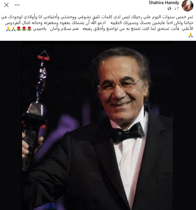 وكتبت شهيرة منشورًا، عبر حسابها الشخصي بموقع التواصل الاجتماعي فيس بوك، قالت فيه: تمر خمس سنوات اليوم على رحيلك، ليس لدي كلمات تليق بشوقي واحتياجي أنا وأولادي لوجودك في حياتنا، ولكن إحنا عايشين بحسك وبسيرتك الطيبة، أدعو الله أن يشملك بعفوه ومغفرته وحنانه لتنال الفردوس الأعلى، فأنت تستحق لما كنت تتمتع به من تواضع وأخلاق رفيعة فنم بسلام وأمان يا حبيبي.