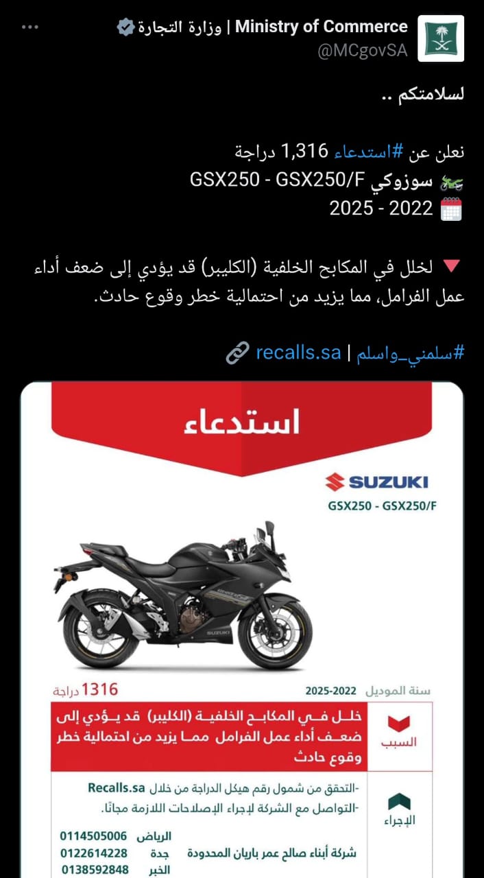 واوضحت الوزارة إن الطرازات المعيبة هي سوزوكي GSX250 - GSX250/F موديلات 2022-2025.