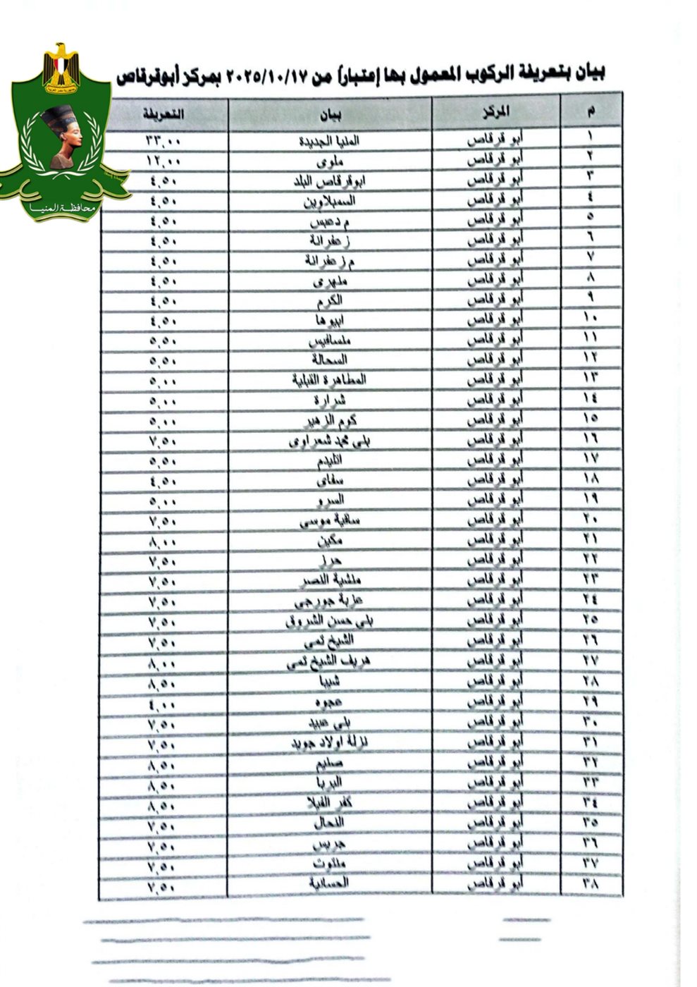 تحددت تعريفة الركوب الجديدة بين مركز مغاغة إلى القاهرة بـ 130 جنيها، فيما جاء سعر تعريفة الركوب بين منطقة بني مزار والقاهرة إلى 135 جنيها، فيما وصل سعر تعريفة الركوب بين مطاي والقاهرة إلى 140 جنيها، ووصل أجرة المواصلات بين سمالوط والقاهرة عند 158 جنيها، فيما وصل سعر تعريفة الركوب الجديدة المنيا والقاهرة إلى 170 جنيها، فيما بلغ سعر تعريفة ركوب أبو قرقاص والقاهرة إلى 172 جنيها، وإليكم قائمة تسعيرة الركوب الجديدة كالتالي: