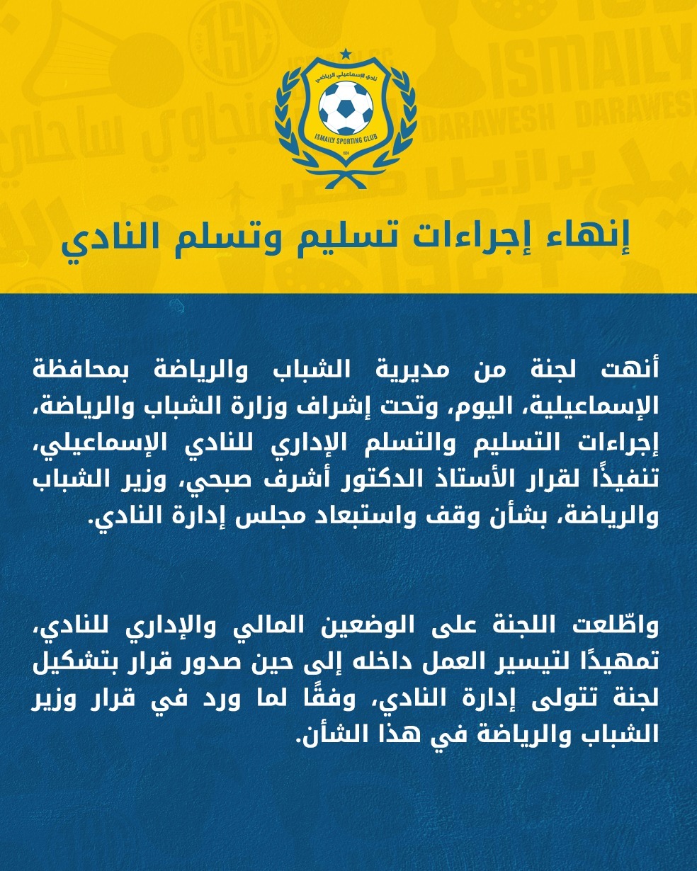 أنهت لجنة تابعة لمديرية الشباب والرياضة بمحافظة الإسماعيلية، اليوم، وبإشراف وزارة الشباب والرياضة، إجراءات التسليم والتسلم الإداري لنادي الإسماعيلي، وذلك تنفيذًا لقرار الدكتور أشرف صبحي، وزير الشباب والرياضة، بشأن وقف واستبعاد مجلس إدارة النادي.
