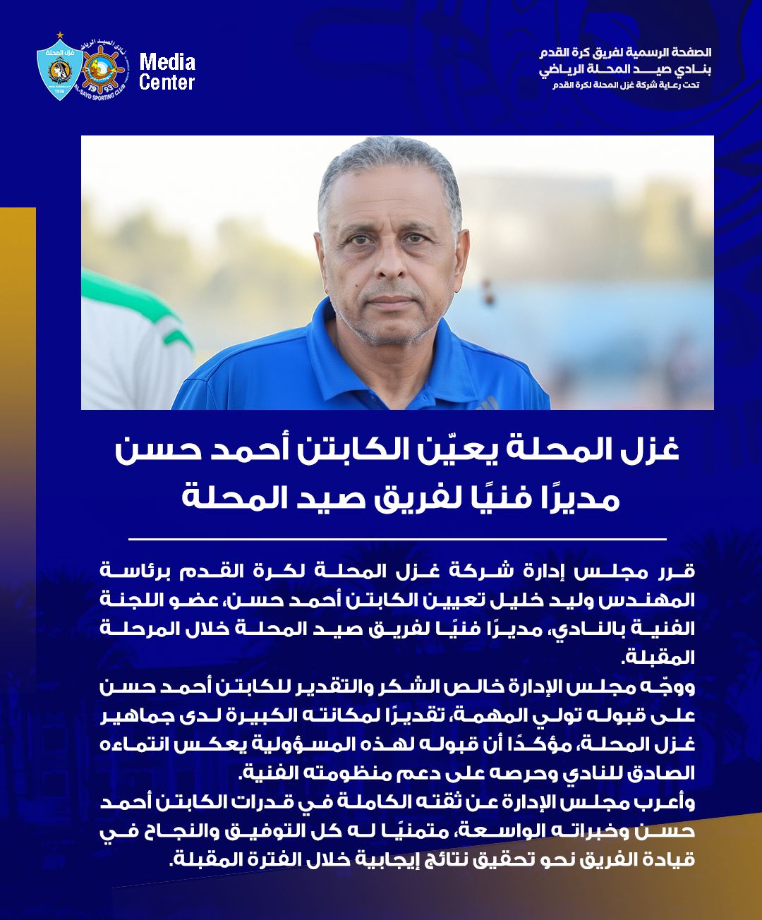قرر مجلس إدارة شركة غزل المحلة لكرة القدم برئاسة المهندس وليد خليل، تعيين الكابتن أحمد حسن، عضو اللجنة الفنية بالنادي، مديرًا فنيًا لفريق الصيد خلال المرحلة المقبلة.