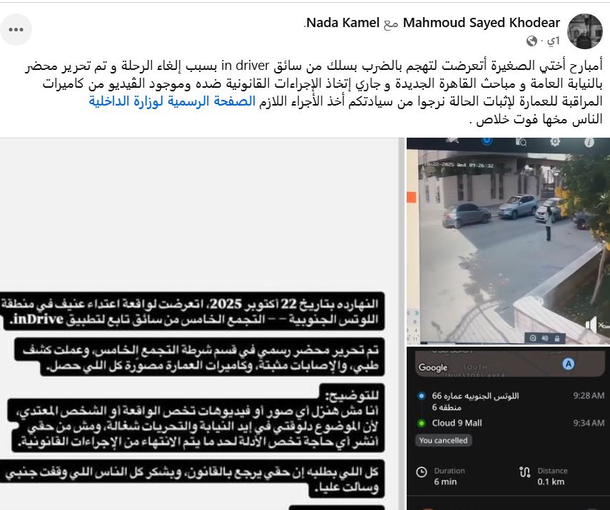 وتعود بداية الواقعة عندما تعرضت فتاة تدعى ندى كامل لواقعة تعدي بالضرب من سائق تابع لشركة النقل الذكي إن درايف، وذلك بعد إلغائها الرحلة، وعلى الفور توجهت إلى قسم شرطة التجمع الخامس لتحرر محضرا بالواقعة يحمل رقم 10815 لسنة 2025.