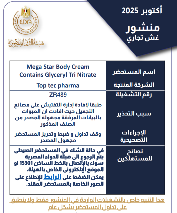 أصدرت هيئة الدواء المصرية منشورًا تحذيريًا بشأن عبوات مجهولة المصدر لمستحضر تجميلي يتم تداوله في الأسواق تحت اسم "Mega Star Body Cream Contains Glyceryl Tri Nitrate"، والمنسوب إنتاجه إلى شركة Top Tec Pharma، ويحمل رقم تشغيلة ZR489.