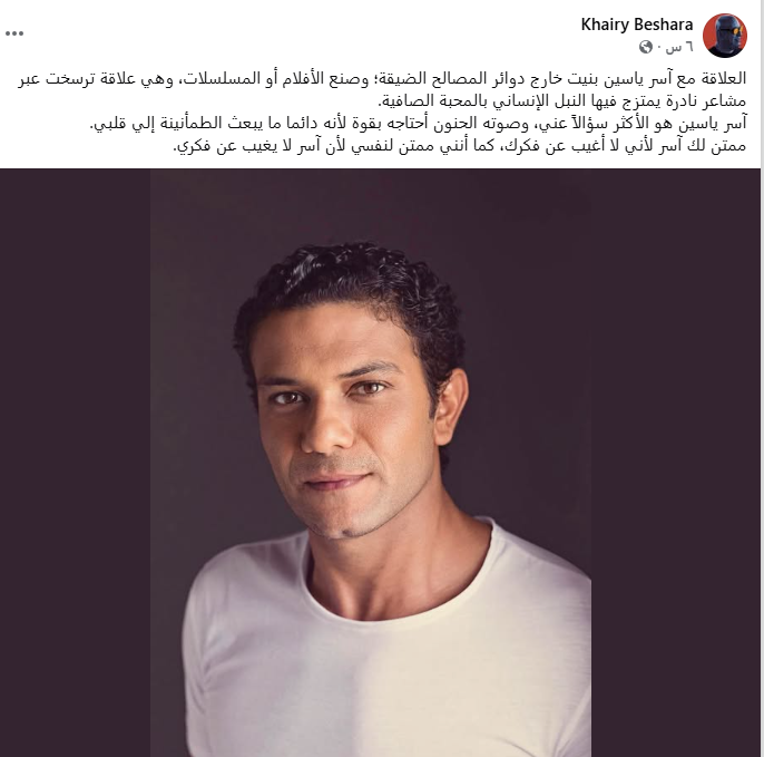 وكتب خيري بشارة منشورا، عبر حسابه الشخصي بموقع التواصل الاجتماعي فيس بوك، قال فيه: العلاقة مع آسر ياسين بنيت خارج دوائر المصالح الضيقة؛ وصنع الأفلام أو المسلسلات، وهي علاقة ترسخت عبر مشاعر نادرة يمتزج فيها النبل الإنساني بالمحبة الصافية.