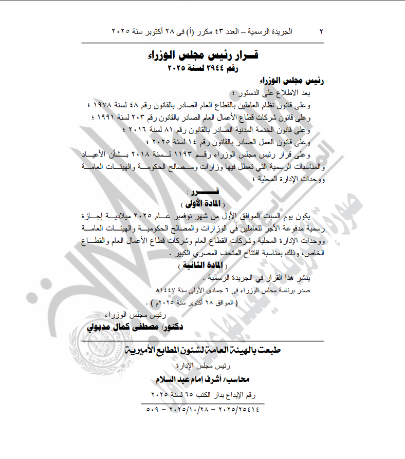 نشرت الجريدة الرسمية في عددها الصادر اليوم الثلاثاء قرار رئيس مجلس الوزراء الدكتور مصطفى مدبولي، بأن يكون يوم السبت المقبل 1 نوفمبر إجازة رسمية مدفوعة الأجر بمناسبة افتتاح المتحف المصري الكبير.