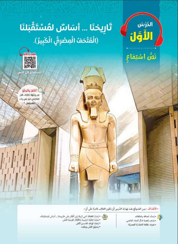وفي الدرس الأول من الوحدة الثانية بكتاب اللغة العربية للصف الأول الإعدادي، تم تناول موضوع المتحف المصري الكبير، حيث جاء النص ليؤكد أن المستقبل لا يُصاغ إلا بأيدٍ تعرف من أين جاءت وإلى أين تمضي، وأن من عرف ماضيه فقد صنع حاضره ومستقبله، وقد عرض الدرس المتحف باعتباره هدية مصر للعالم، وصرحًا حضاريًا يجسد رؤية الدولة في الاستثمار في الثقافة، ويُسهم في ربط النشء بجذور حضارتهم، وغرس الفخر والانتماء في نفوس الطلاب.