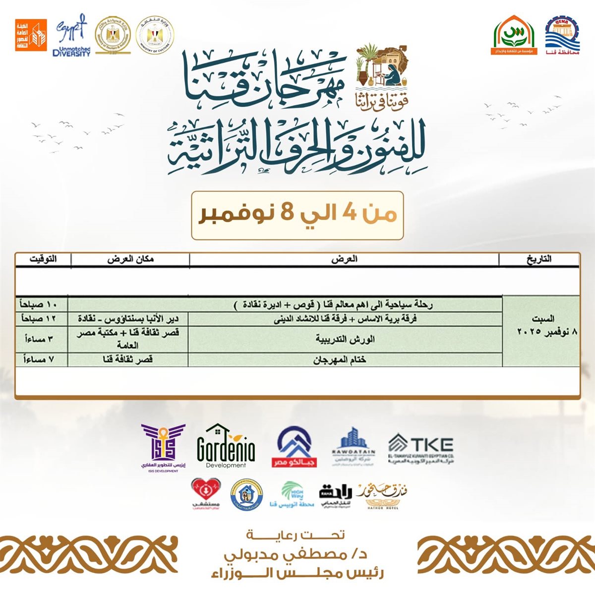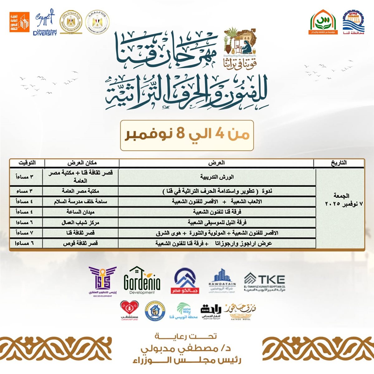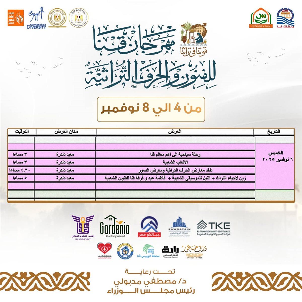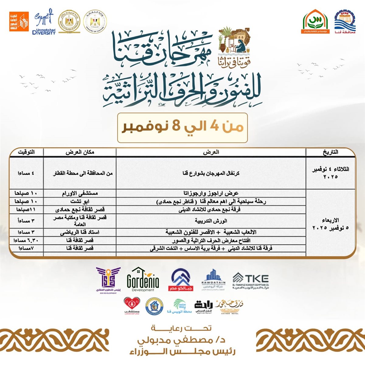تنطلق، اليوم الثلاثاء، فعاليات مهرجان قنا لفنون الحرف اليدوية والألعاب القديمة والعمارة التراثية، تحت رعاية الدكتور خالد عبد الحليم محافظ قنا، بمشاركة واسعة من الحرفيين والفنانين الشعبيين من مختلف أنحاء المحافظة.