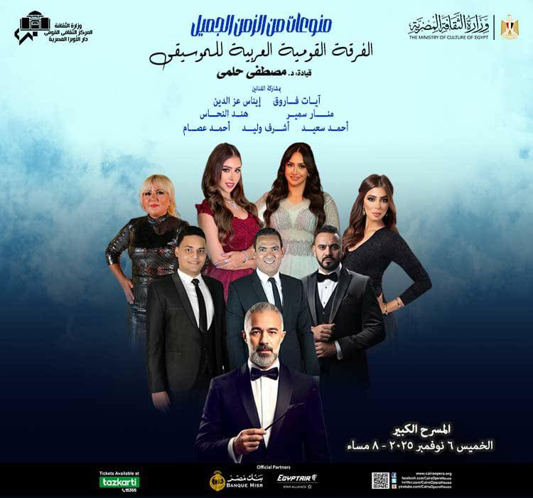 تشارك الفرقة القومية العربية للموسيقى بقيادة المايسترو الدكتور مصطفى حلمي، بمجموعة مختارة من طربيات عمالقة زمن الفن الجميل، منها: أحضان الحبايب - ليه يا قلبي لي - ليالي الأنس - مش عوايدك - بلاش تفارق - لاموني الناس على حبي، وذلك في تمام الساعة الثامنة مساء الخميس الموافق 6 نوفمبر 2025 على المسرح الكبير.