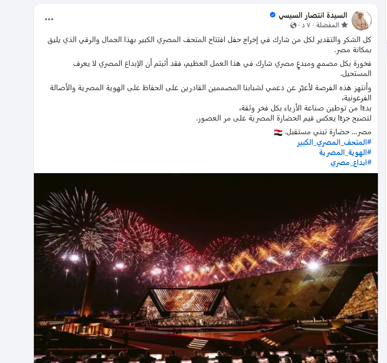 السيدة انتصار السيسي تُشيد بحفل افتتاح المتحف المصري الكبير وتؤكد دعمها للمبدعين المصريين