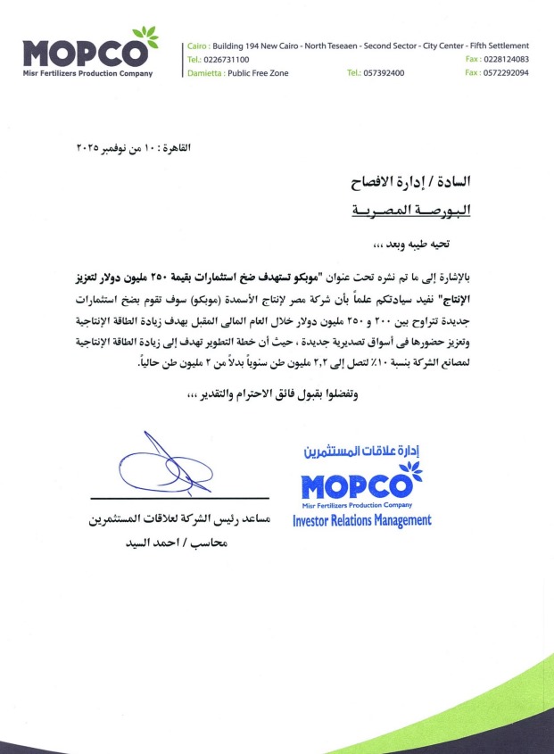 جاء هذا التوضيح من الشركة على خلفية ما تم تداوله مؤخرًا تحت عنوان موبكو تستهدف ضخ استثمارات بقيمة 250 مليون دولار لتعزيز الإنتاج، حيث أكدت الشركة صحة التوجه الاستثماري لكنها وضعت الإطار الزمني والمادي الدقيق للخطة.