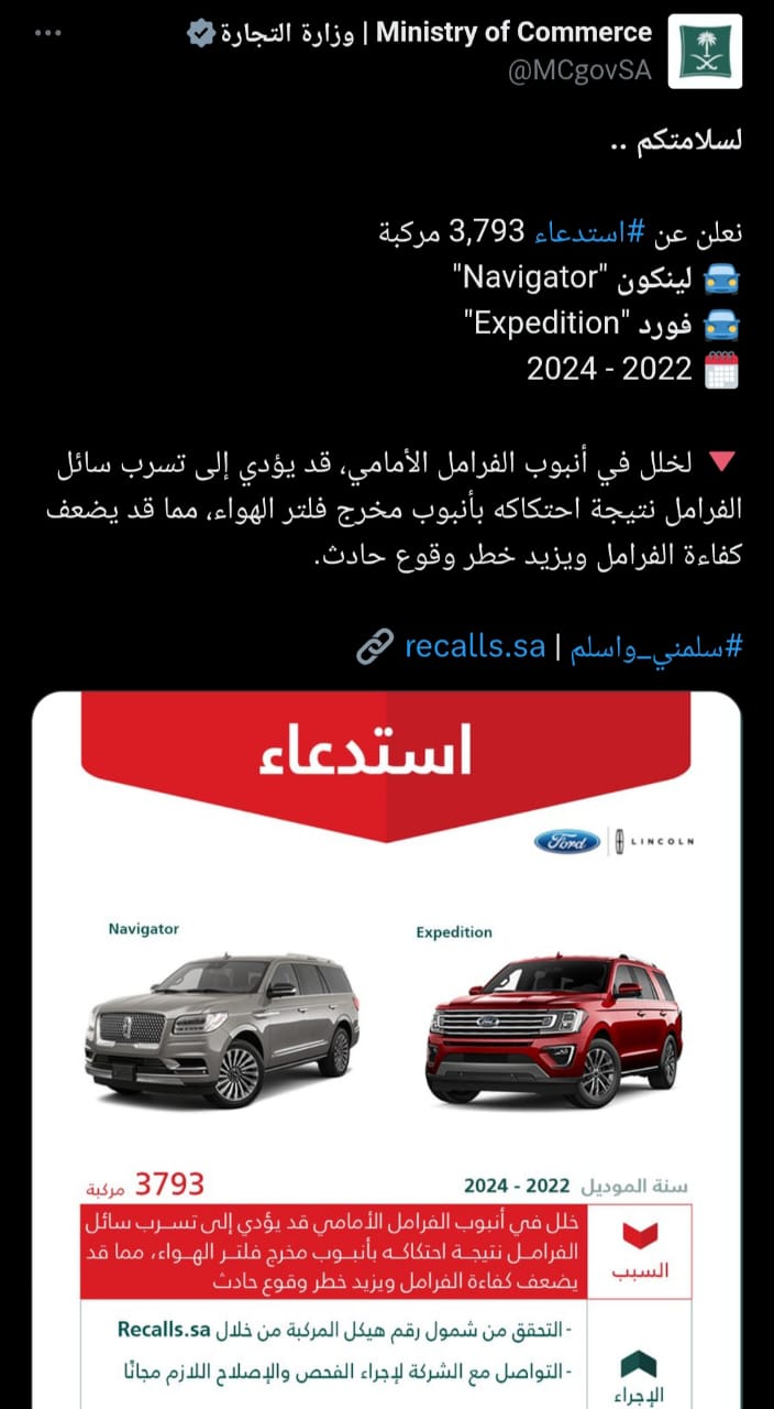 أعلنت وزارة التجارة السعودية عبر حسابها الموثق على منصة إكس استدعاء حوالي 3،793 لينكون وفورد.
