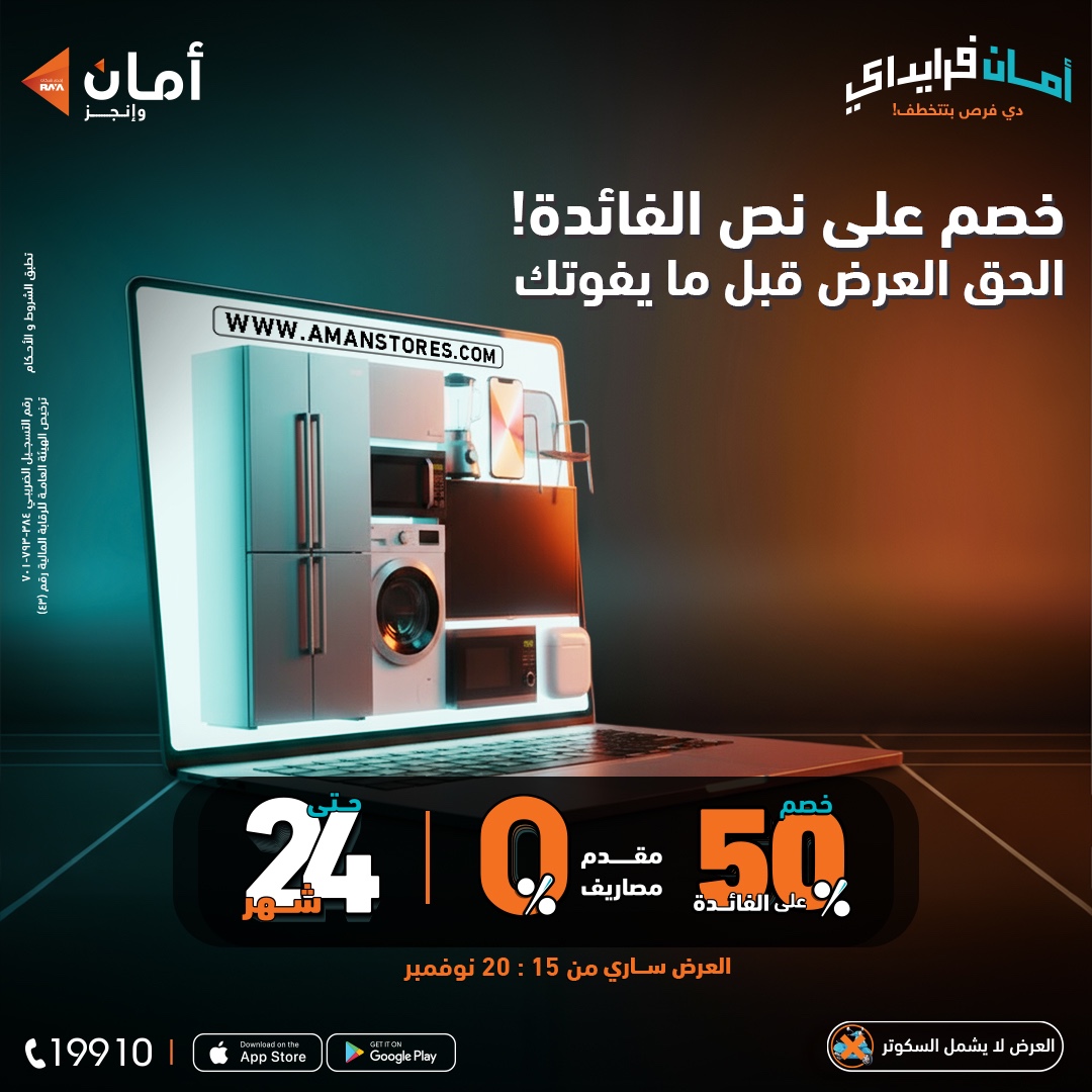 بمناسبة البلاك فرايداي 1 نوفمبر حتى 30 نوفمبر، تقدم أمان ستورز عروض وخصومات قوية على أسعار الأجهزة الكهربائية والإلكترونيات والموبايلات وعلى أنظمة التقسيط.