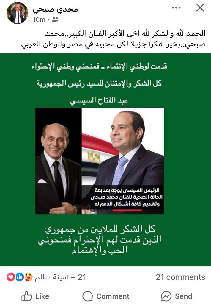وكتب محمد صبحي في منشور عبر حسابه الشخصي بموقع فيس بوك: قدمت لوطني الانتماء فمنحني وطني الاحتواء، كل الشكر والامتنان لرئيس الجمهورية عبد الفتاح السيسي، كل الشكر للملايين من جمهوري الذين قدمت لهم الاحترام فمنحوني الحب والاهتمام.