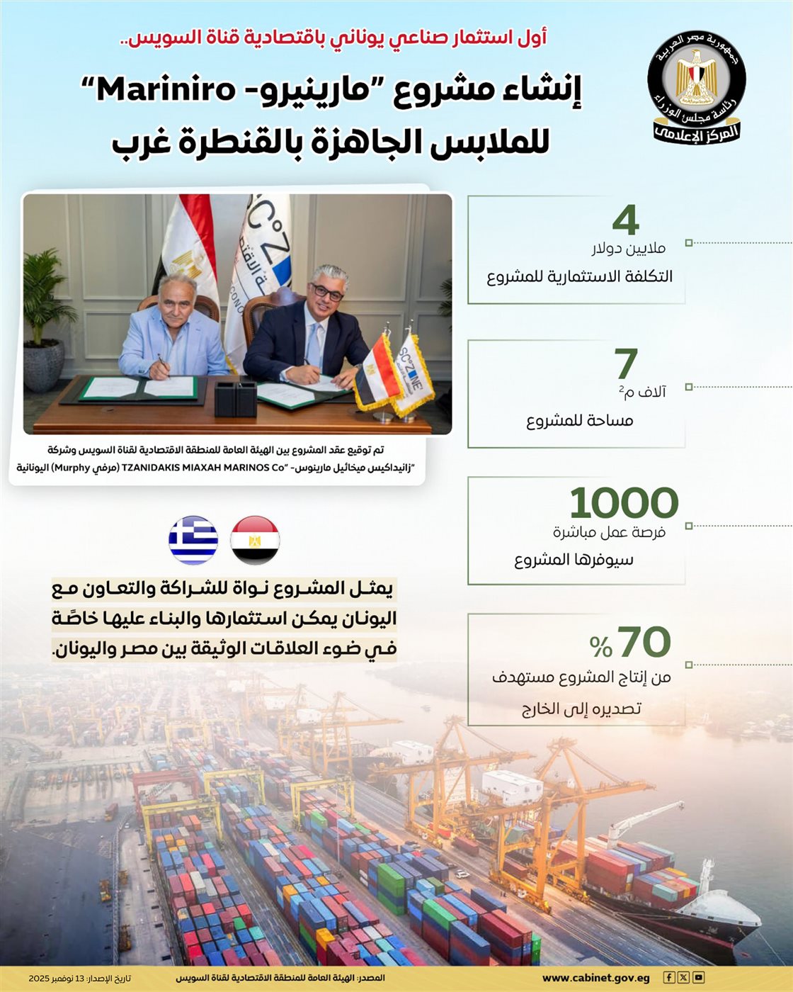 نشر المركز الإعلامي لمجلس الوزراء، انفوجرافًا على صفحته الرسمية على موقع التواصل الاجتماعي، “ فيسبوك”، حيث سلط الضوء من خلاله على إنشاء مصنع مارينيرو- Mariniro للملابس الجاهز كـ أول استثمار صناعي يوناني باقتصادية قناة السويس.