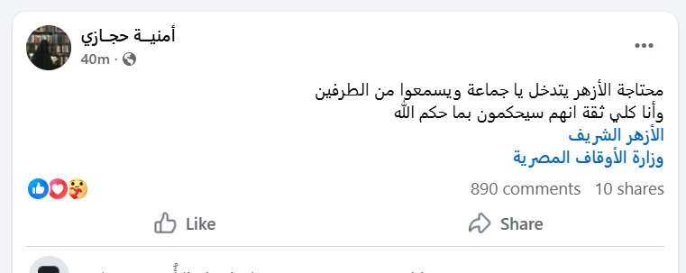 وقالت أمنية حجازي في المنشور: محتاجة الأزهر يتدخل يا جماعة ويسمعوا من الطرفين، وأنا كلي ثقة أنهم سيحكمون بما حكم الله.