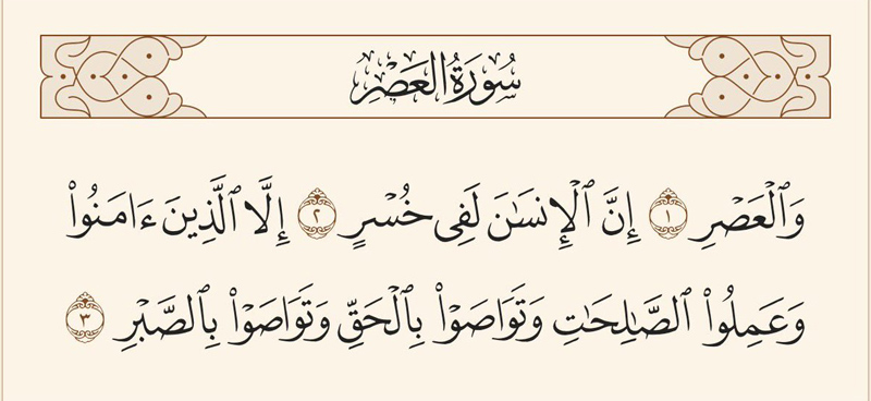 وحول تفسير والعصر إن الإنسان لفي خسر، يقول الله تعالى: «وَالْعَصْرِ * إِنَّ الْإِنْسَانَ لَفِي خُسْرٍ * إِلَّا الَّذِينَ آمَنُوا وَعَمِلُوا الصَّالِحَاتِ وَتَوَاصَوْا بِالْحَقِّ وَتَوَاصَوْا بِالصَّبْرِ»، وهي آيات قصيرة المبنى عظيمة المعنى، لخصت منهج النجاة في أربع ركائز كبرى.