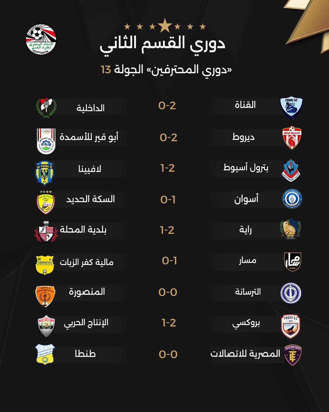 شهدت مباريات الجولة الثالثة عشرة من دوري القسم الثاني دوري المحترفين إثارة كبيرة، بعد خسارة المتصدر أبو قير للأسمدة أمام ديروط، صاحب صدارة جدول الترتيب برصيد 27 نقطة، بفارق 3 نقاط عن القناة الوصيف.