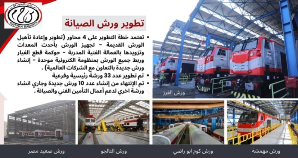 السكك الحديدية تنتهي من تطوير 33 ورشة صيانة للقطارات.. وإنشاء 10 جدد