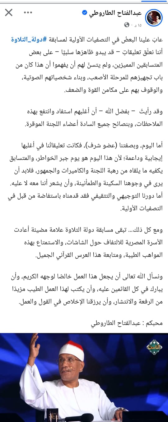 وكتب الطاروطي عبر حسابه على موقع التواصل الاجتماعي فيس بوك: عابَ علينا البعضُ في التصفيات الأولية لمسابقة دولة التلاوة أننا نعلّق تعليقاتٍ – قد يبدو ظاهرُها سلبيًّا – على بعض المتسابقين المميزين، ولم يتسنَّ لهم أن يفهموا أن هذا كان من باب تجهيزهم للمرحلة الأصعب، وبناء شخصياتهم الصوتية، والوقوف بهم على مكامن القوة والضعف.