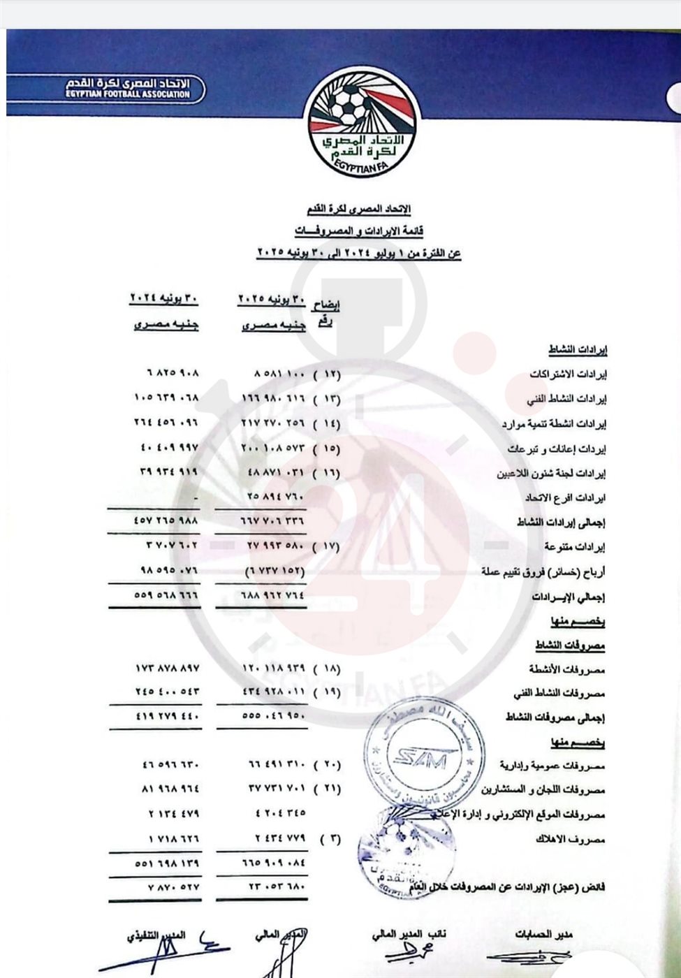 كشف الحساب المالي الختامي للاتحاد المصري لكرة القدم تفاصيل إيرادات ومصروفات الاتحاد في العام المالي الأخير، وتحديدا في الفترة من 1 يوليو 2024 إلى 30 يونيو 2025.