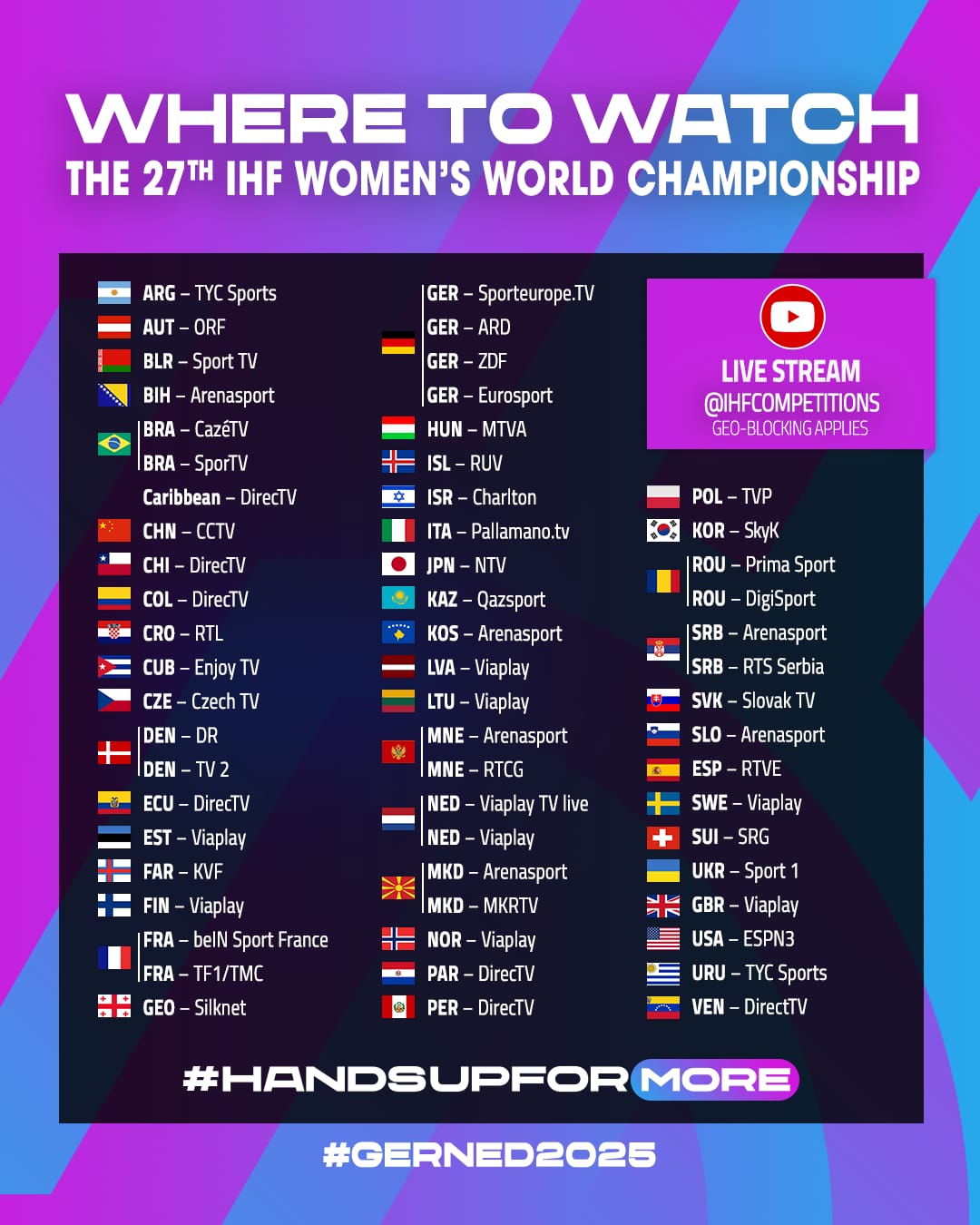 أعلن الاتحاد الدولي لكرة اليد إتاحة بث مباشر لجميع مباريات بطولة العالم لكرة اليد سيدات، والتي تُقام بمشاركة منتخب مصر، عبر قناة IHF – Competitions الرسمية على منصة يوتيوب، وذلك في المناطق التي لا تمتلك اتفاقيات خاصة بحقوق البث.